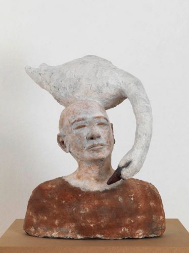 Doch auch ihre Skulpturen sind einzigartig und verwirrend zugleich. Immer wieder sind es Tiere, die den dargestellten Menschen scheinbar aus dem Kopf wachsen. Gerade so, als ob sie aus den Gedanken des Dargestellten entspringen.